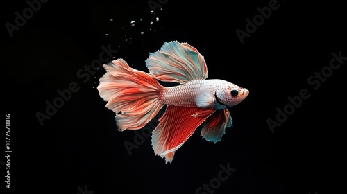A vibrant Siamese fighting fish, or betta, with red, orange, and white fins swims against a black background.