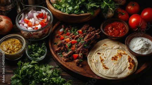 A vibrant spread of grilled meat, fresh vegetables, and tortillas, showcasing a delicious feast perfect for sharing and enjoying.
