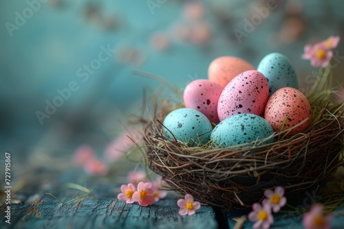 A vibrant spring aerie, adorned with delicate easter eggs and blooming flowers, holds the promise of new life and the celebration of the season