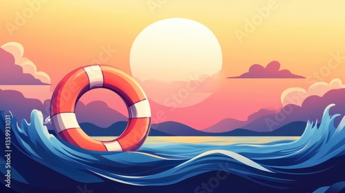 A vibrant sunset over a tranquil ocean scene featuring a lifebuoy floating amidst gentle waves