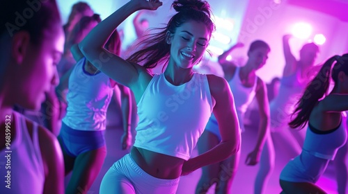 A vibrant team of fitness enthusiasts energizes a colorful studio with dynamic aerobics and collaborative spirit.