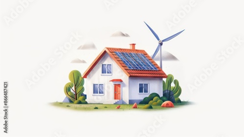 A vibrant watercolor illustration of a house with solar panels and a wind turbine, representing sustainable energy, perfect for a clean energy theme