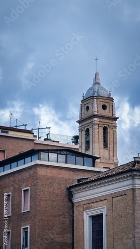 A view across the rooftops of Rome at sunset on a winter day. Domes of old church