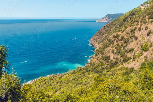 A view along the coastal path from the village of Corniglia, Italy in the summertime