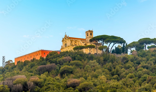 A view of a hilltop monastery overlooking Ercolano near Naples, Italy