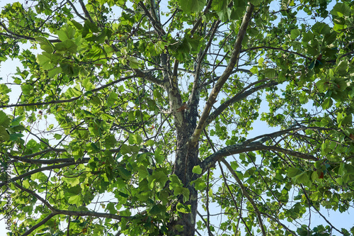 A view of a tree full of summer leaves during a sunny day.