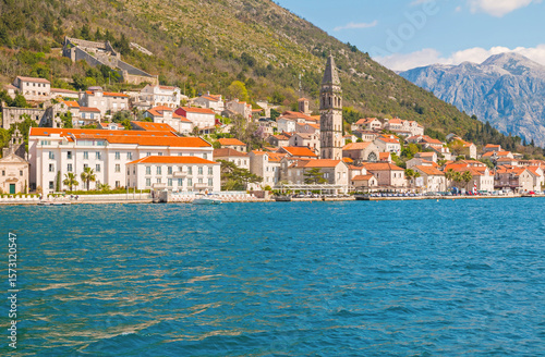 A view of Perast, Montenegro, from a boat on a sunny day, crystal-clear Adriatic waters, historic stone buildings, and majestic church towers create a dreamy coastal escape in the heart of the Bay.