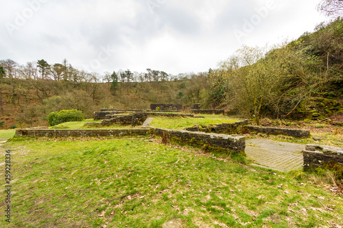 A view of ruin site around green vegetation and trees under a white cloudy sky