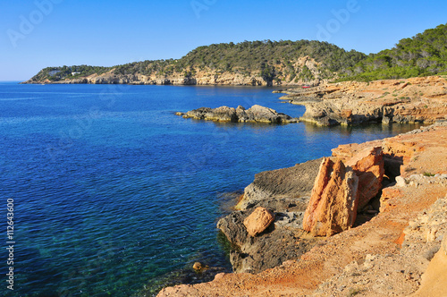 a view of the Mediterranean Sea and a cliffy landscape of the northeastern coast of Ibiza Island, in the Balearic Islands, Spain