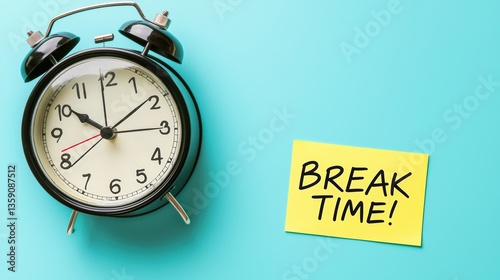 A vintage alarm clock next to a bright sticky note that reads "BREAK TIME!" on a teal background, symbolizing a reminder to take a break, Mental health in the workplace.
