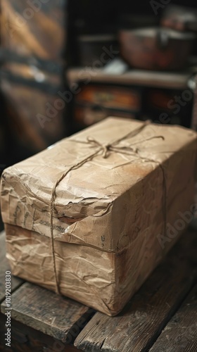 A vintage brown package in torn paper sits on a rustic wooden table, adding a cozy touch