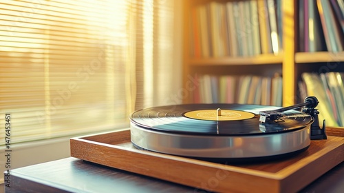 A vintage record player is placed on a wooden tray by a window with bright sunlight, with a shelf of vinyl records.
