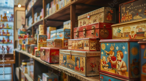 A vintage toy store with tin wind-up toys and wooden blocks. Concept of timeless play things for children
