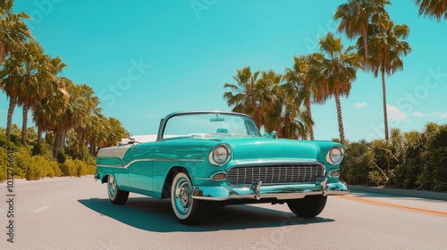 A vintage turquoise convertible car parked on a sunny coastal road, surrounded by palm trees and a clear blue sky.