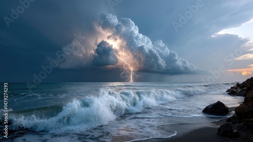 A violent ocean storm with towering dark clouds swirling over turbulent waves
