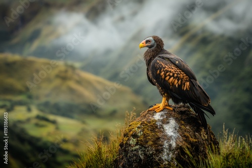 A vulture perched on a rugged cliffside, overlooking a dense jungle below, with mist rising through the trees