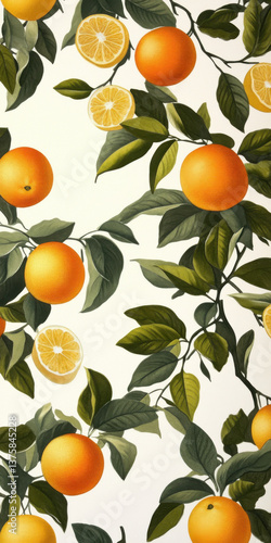 A wallpaper pattern of citrus fruits and leaves,