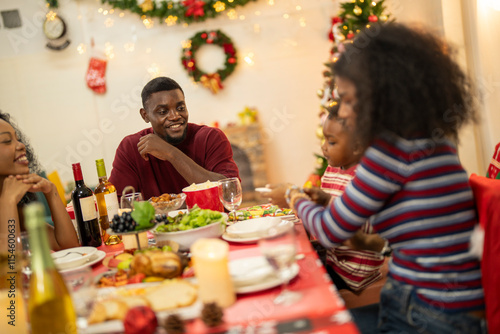 A warm Christmas family dinner with a father serving food to his young child, surrounded by festive decorations, a Christmas tree, and a holiday table spread. Joyful and cozy holiday atmosphere.