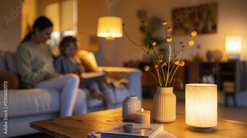A warmly lit living room with a modern wooden table, decorative vases, and candles. In the background, two people sit comfortably on a sofa, creating a peaceful and homey scene