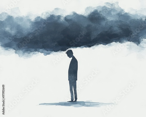 A watercolor illustration of a solitary figure standing beneath a dark cloud, symbolizing introspection and emotional struggle.