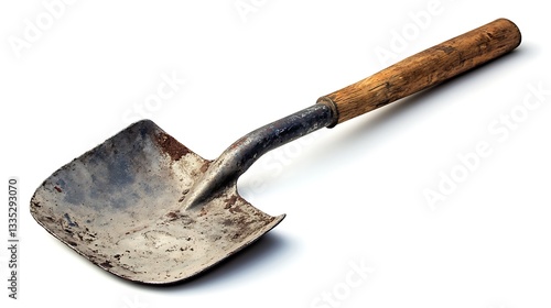 A weathered garden shovel with a wooden handle, used for digging and planting.