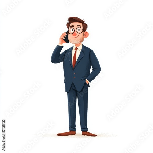 A well-dressed animated character in formal attire with glasses talks on his cell phone,
