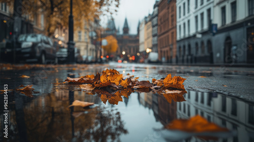 A wet city street with scattered autumn leaves on the pavement, lined with storefronts, creating a moody urban autumn atmosphere.