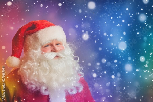 A whimsical Santa Claus outfit designed with vibrant rainbow colors, set against a starry night sky with twinkling snowflakes.
