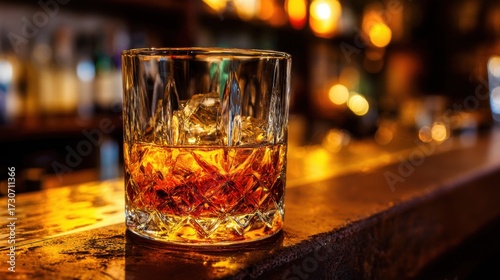 A whiskey glass filled with amber liquid and ice rests on a wooden bar counter. The warm glow of bar lights creates an inviting atmosphere. Patrons converse in the background.