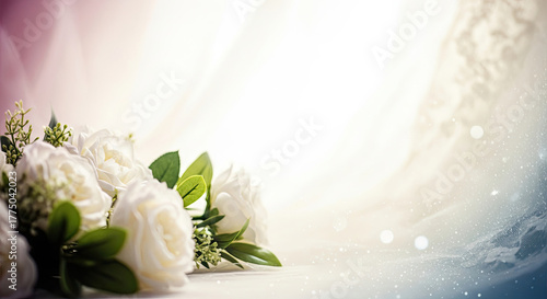 A white and pink floral arrangement with white roses and green leaves on a white background with a soft, ethereal, and delicate texture.