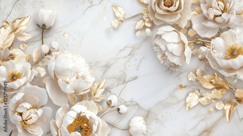A white background features golden flowers and leaves, white peonies, and golden decorative elements.