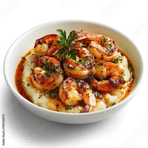 a white bowl filled with shrimp and mashed potatoes