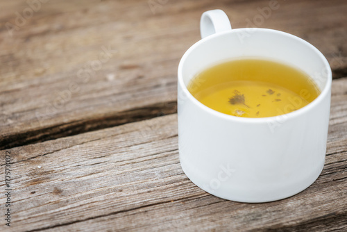 A white cup filled with herbal tea sits on a rustic wooden surface, showing warm tones and small floating herbs in the golden liquid.