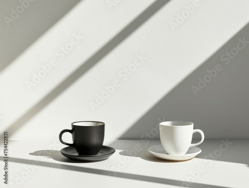 a white cup of coffee and a black cup of coffee on a white background, light coming through the window