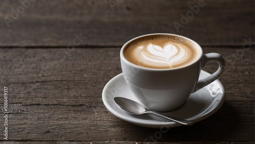 A white cup of coffee with a heart-shaped design on the foam sits on a wooden table, accompanied by a spoon.