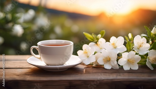 a white cup of tea sits on a rustic wooden table accompanied by delicate white flowers the background is blurred creating a warm and inviting atmosphere