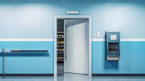 A white door slightly open reveals a glimpse into a commercial refrigeration room. Shelves stocked with food products can be seen behind the door, hinting at the cold, frozen world within