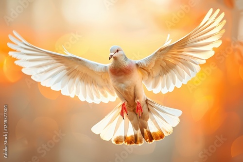 A white dove in flight, wings spread wide, bathed in warm, golden sunlight.