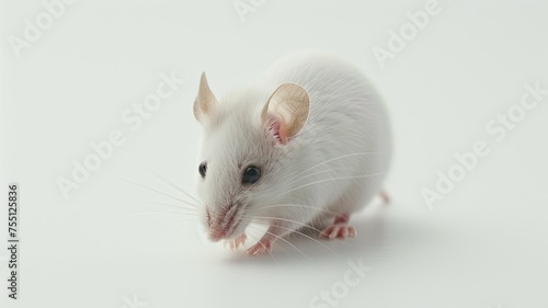 a white, grey, or black harvest or house mouse against a pristine white background, showcasing its natural appearance and behavior.