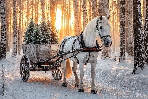 A white horse pulls a cart filled with evergreen trees through a snowy forest at sunset, evoking a serene winter scene.