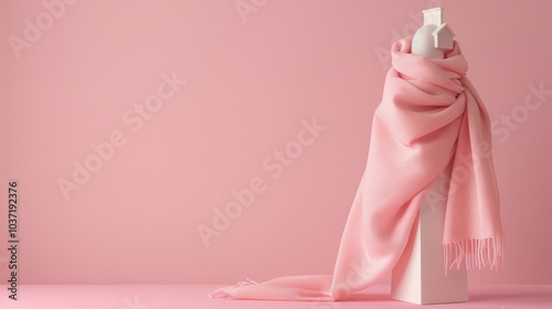 A white house figurine dressed in a soft pink scarf on a stand with a pastel pink background