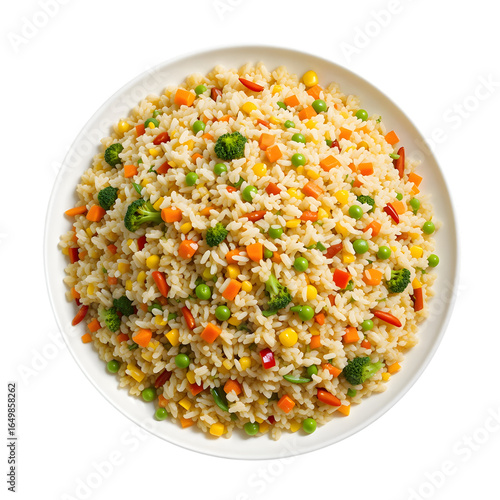 A white plate heaped with colorful vegetable fried rice mixed with vibrant diced vegetables in white transparent png background cutout