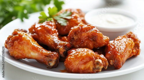 A white plate of crispy chicken wings coated in a tangy sauce, served with a side of ranch dressing.