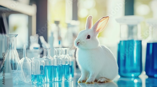 A white rabbit sits in front of beakers filled with blue liquid, with sunlight filtering through the windows.