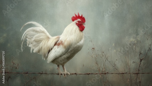 A white rooster perched on a rusty fence, against a soft, muted background