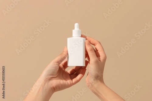 A white serum bottle held in graceful hands, set against a solid color backdrop, perfect for beauty advertising that emphasizes purity and sophistication in skincare