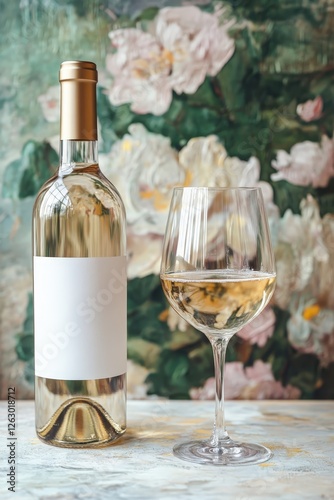 A white wine bottle and glass depicted against a charming floral painting backdrop, showcasing sophistication and elegance for celebratory and refined occasions.