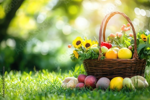 A wicker basket filled with fruits and sunflowers. Perfect for illustrating a healthy lifestyle, agriculture, or food markets.