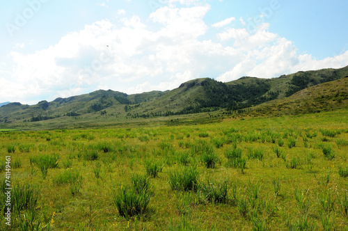 A wide clearing with scattered sparse bushes at the foot of a high mountain range.