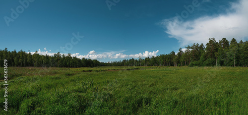 A wide panorama of the beautiful natural landscape with a swamp. Coniferous forest and sky. Green forest, blue sky and white fluffy clouds at the sunny summer day